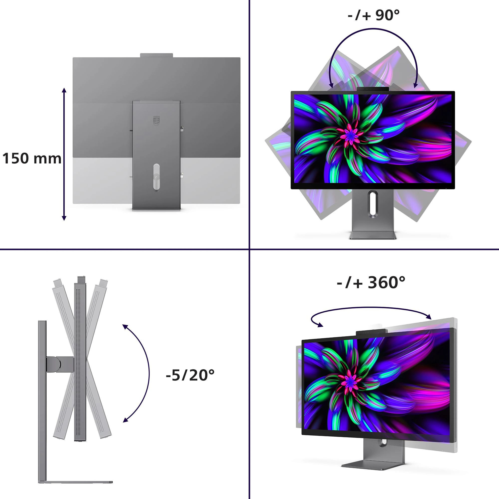 - Ajustable en hauteur. Inclinable. Rotatif horizontalement. Pivotant verticalement.