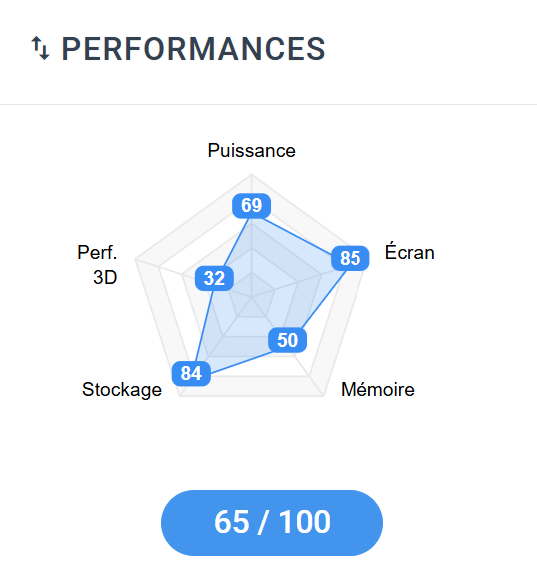 Les sous-indices aident à comprendre ce positionnement. Écran : 85/100, c’est clairement l’un de ses vrais arguments d’achat. Puissance : 69/100, cela confirme une machine sérieuse pour le multitâche, le travail soutenu et les logiciels courants exigeants. Stockage : 84/100, rien à redire pour un usage quotidien. En revanche, Mémoire : 50/100 rappelle que la bonne capacité actuelle n’efface pas la limite d’une RAM soudée et plafonnée, et Performance 3D : 32/100 remet immédiatement les choses à leur place : ce n’est pas un portable fait pour acheter les yeux fermés si votre priorité est le jeu ou l’accélération graphique intensive.