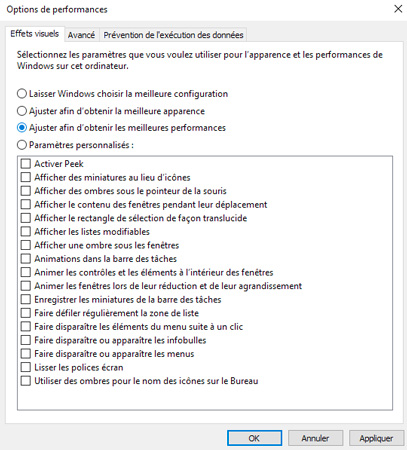 Si vous êtes sous Windows 10, vous pouvez désactiver les effets d’animation et de transition des fenêtres. Pour ce faire, utilisez la combinaison « CTRL+R » puis saisissez la commande « sysdm.cpl », dirigez-vous ensuite dans l’onglet « Paramètres systèmes avancés » puis le bouton « Paramètres » situé sous la partie « Performances ». Ici, sélectionnez l’option « Ajuster afin d’obtenir les meilleures performances ».