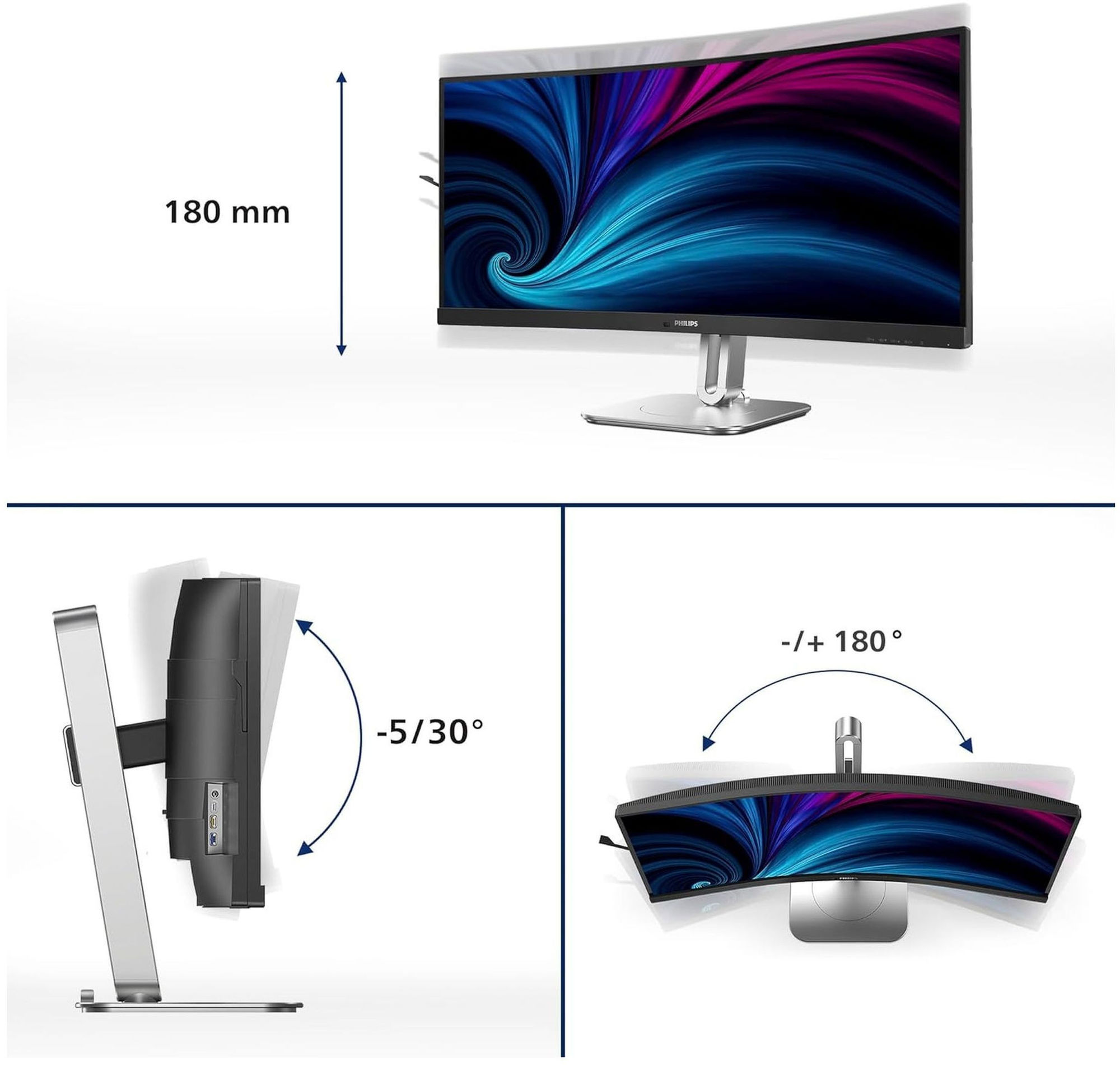 - Ajustable en hauteur. Inclinable. Rotatif horizontalement. Pivotant verticalement.