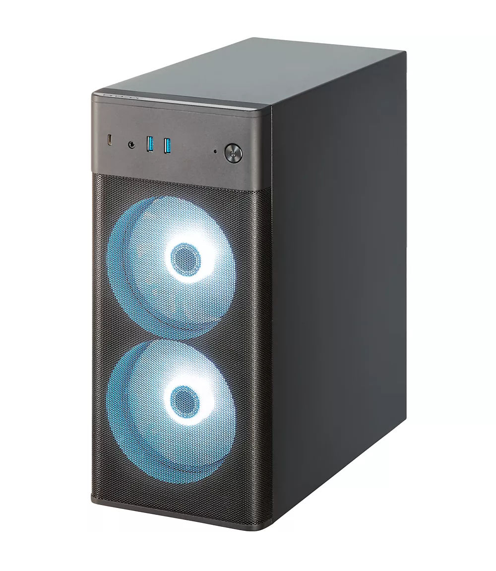Sur le Medion Erazer Recon P45 (MD340057), on est clairement sur une esthétique gamer (ventilation en façade, panneau latéral transparent) : c’est pensé pour être posé sur ou sous le bureau et fonctionner tout de suite, sans assemblage.