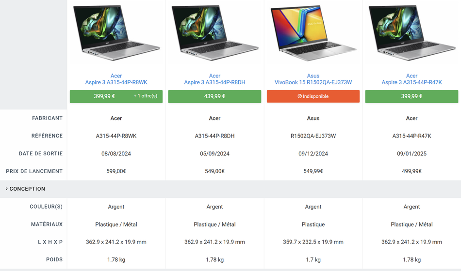 Pour moins de 600 €, l’A315-44P-R8WK offre un bon compromis puissance/prix dans le segment bureautique. Pour d’autres portables économiques, consultez notre sélection de meilleurs portables pas cher sur Comparez-malin.