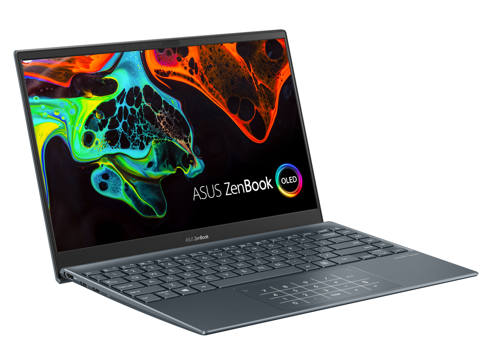 Asus utilise sur cette référence une dalle OLED avec un taux de rafraîchissement de 60 Hz. La luminosité maximale est annoncée à 400 cd/m². L'écran propose des angles de vision de 178°. La dalle couvre également l'espace colorimétrique plus étendu du DCI-P3 à 100% pour un rendu parfait des couleurs.