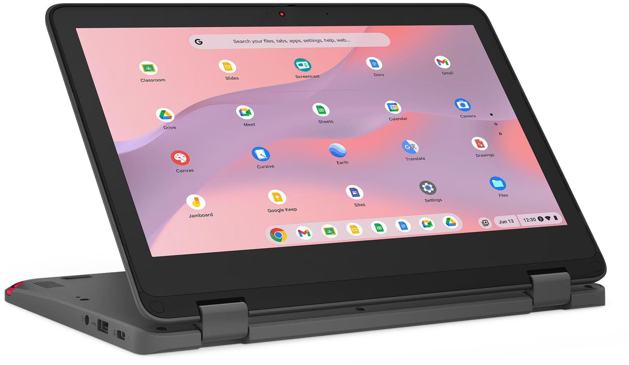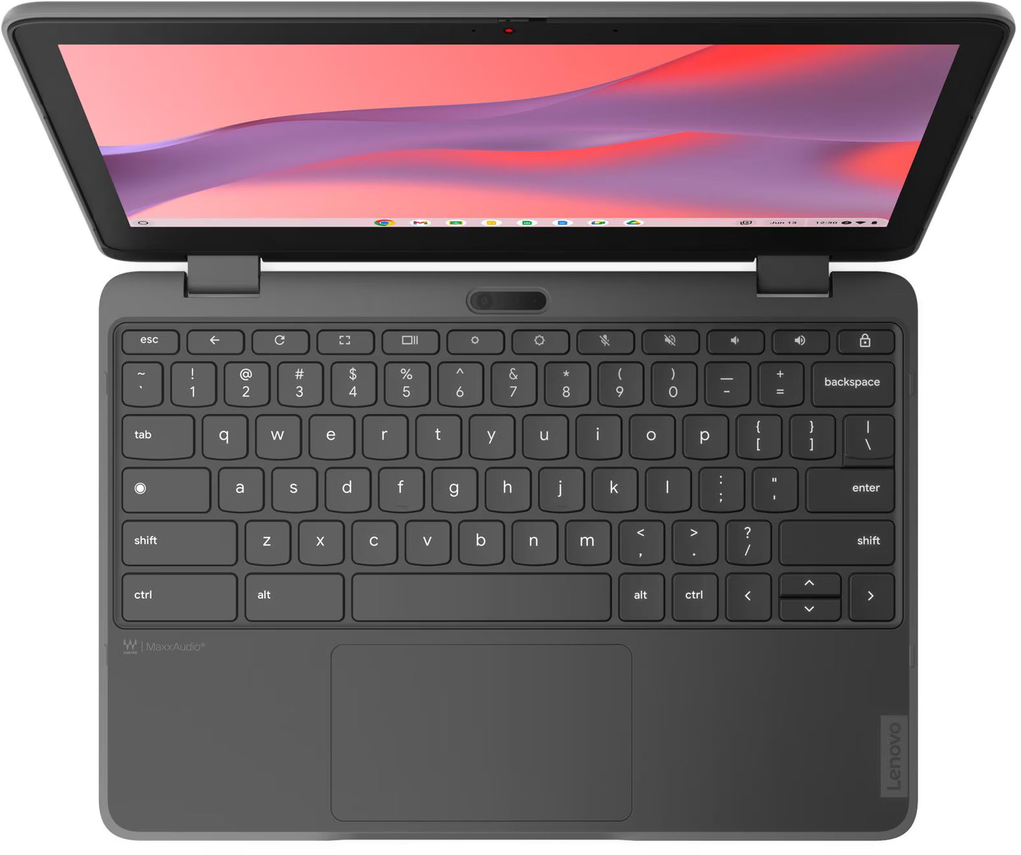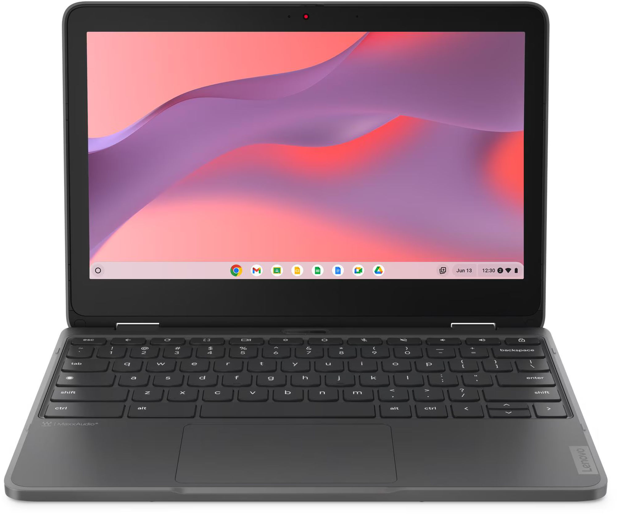Avec son écran tactile 11.6" et sa charnière à 360°, le Lenovo 300e Yoga Chromebook Gen 4 propose plusieurs modes : portable classique pour rédiger des devoirs, mode tente pour regarder une vidéo, mode support pour une présentation, et mode tablette pour la consultation de ressources ou les activités interactives. La petite diagonale rend l’appareil facile à manipuler et à poser sur un bureau d’élève, tout en offrant suffisamment de surface pour afficher un document et une page web côte à côte avec un zoom adapté. L’écran est brillant, ce qui donne une image agréable pour les vidéos et les contenus éducatifs, mais peut gêner en extérieur très lumineux ; il est alors utile d’augmenter la luminosité ou de se placer à l’ombre. Pour la saisie prolongée, le clavier AZERTY est complet et correctement dimensionné pour un usage régulier malgré le format compact.