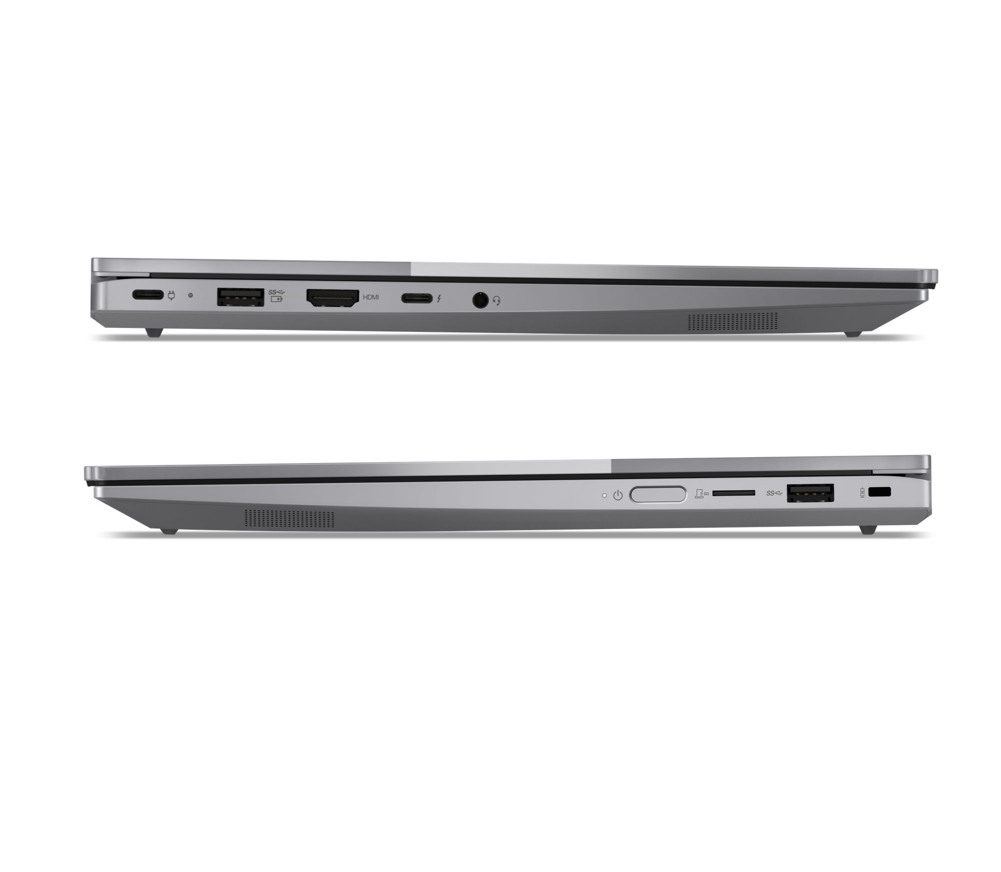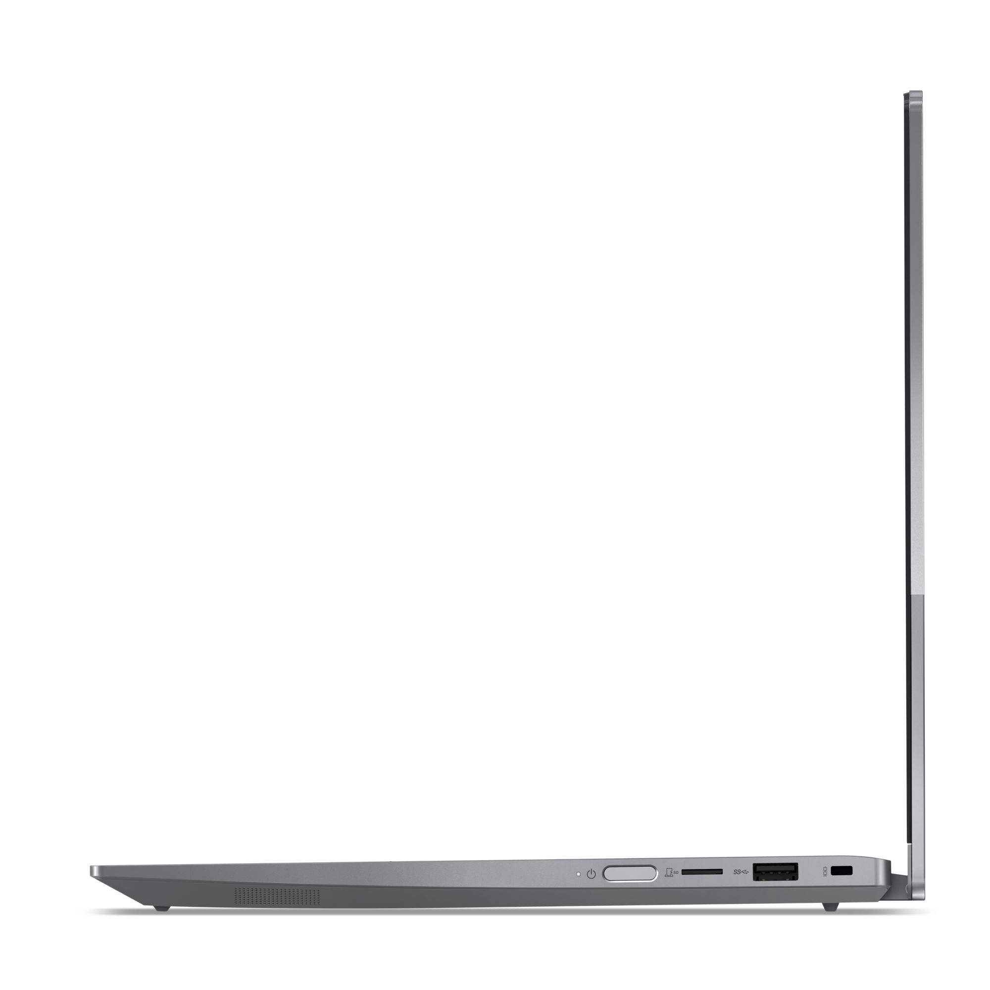 La tranche révèle une belle connectique pour un 14" fin, avec USB-A, USB-C, HDMI, RJ45 et lecteur de carte mémoire.